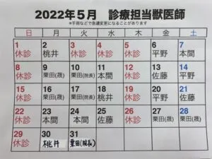 5月 鮭川分院の診療担当獣医師