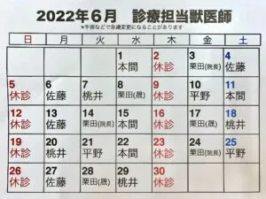6月 鮭川分院の診療担当獣医師
